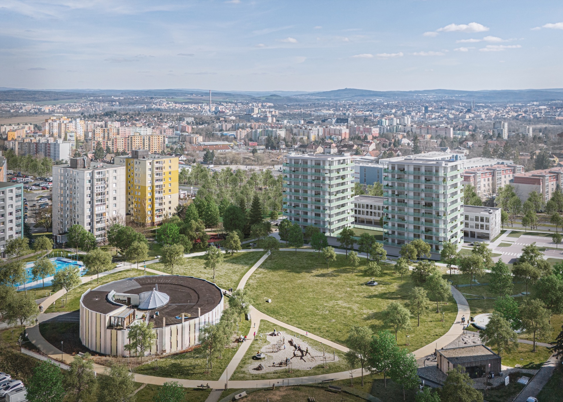 Velkou přidanou hodnotou projektu je výhled. Vzhledem k tomu, že se budovy nachází na kopci na okraji města ve vyšší nadmořské výšce, než zbytek města, bude z vyšších pater výhled prakticky na celou Plzeň a okolí. Z oken na východ uvidíte na lesy, bolevecké rybníky a část města. Z oken na jih uvidíte na celé město a daleko za něj. Z oken na západ zase na pole, louky a lesy za Plzní. A okna na sever jsou směrovaná do parku. Z nižších pater tedy uvidíte park, z vyšších pater i sídliště a lesy za ním.
